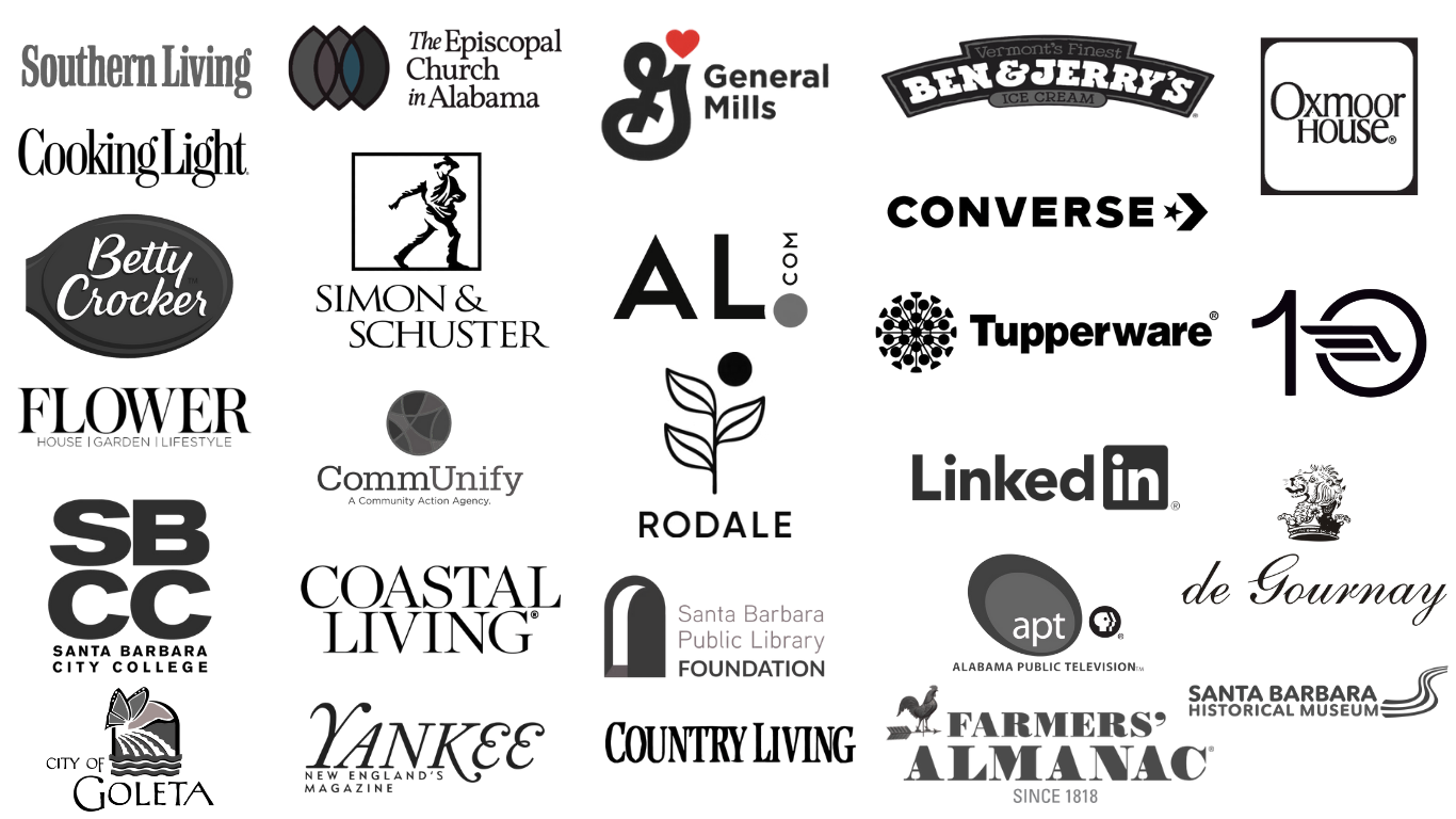Including work for the National Endowment for the Arts, LinkedIn, Alabama Public Television, De Gournay, University of California at Santa Barbara, Santa Barbara City College, The City of Goleta, The City of Carpinteria, The Birmingham News, YMCA, CommUnify, The Santa Barbara Historical Museum, The Santa Barbara Public Library Foundation, Breast Cancer Resource Center of Santa Barbara, Episcopal Diocese of Alabama, Storyteller Children’s Center, St. Vincent’s, Validation Ale, and Newsmakers — alongside editorial and commercial work for Betty Crocker, General Mills, Southern Living, Country Living, Coastal Living, Cooking Light, Flower Magazine, The Farmer’s Almanac, Simon & Schuster, Rodale Press, Oxmoor House, Ten Speed Press, Tupperware, Ben & Jerry’s, Converse, and Yankee Magazine.